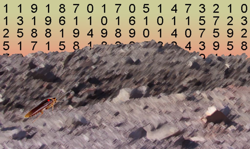 Winking at Haseya, Sani pointed to the wall above their table. A swarm of cockroaches had gathered, waiting for a chance to scavenge among the crumbs left after their meal. "Cockroaches," muttered Sani, scrunching his face in disgust, "have a survival advantage over other wildlife because they can tolerate ionizing radiation that kills other species. In a postnuclear age they breed and flourish, ruling the dark places where nothing else lives." He shook his arm at the assembling insects, and they scattered.