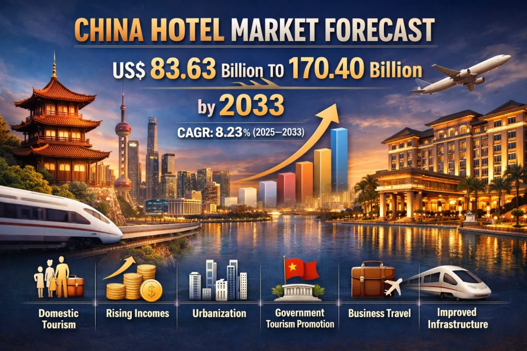 China’s hotel industry is entering a powerful new growth phase, supported by a resurgence in travel, rising incomes, and continuous infrastructure development. According to Renub Research, the China Hotel Market is expected to reach US$ 170.40 billion by 2033, up from US$ 83.63 billion in 2024, registering a compound annual growth rate (CAGR) of 8.23% from 2025 to 2033.