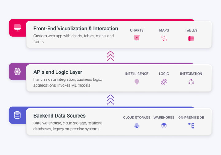- APIs and Logic Layer. Between the data and the UI is a backend service layer that pulls together and processes data on demand. This layer handles data integration, business logic, aggregations, and even invokes machine learning models. For example, an API might fetch the latest sales data, run an ML forecasting model, and return the results. This ensures the UI always has live, consistent data without building it manually in Excel;