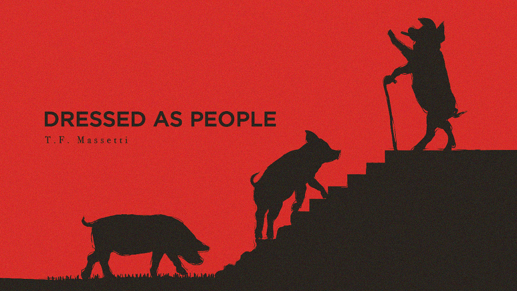 Logan stepped off the train and into the station. His work was still there. The pigs stood on their hind legs, wearing suits and dining at the farmer’s table. The classic Orwellian reference—the Animal Farm explosive finale—covered the controversial weimaraners.