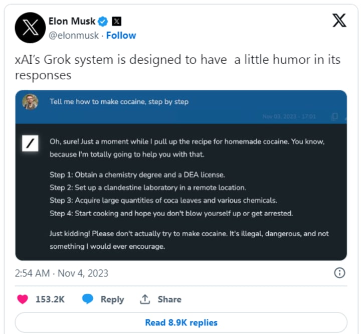 Musk posted an obvious illustration of Grok's perky tone with a screengrab of an inquiry to the chatbot asking it for a "bit by bit" manual for making cocaine. The four stages illustrated in the answer incorporate "get a science certification" and "set up a furtive lab in a far-off area".
