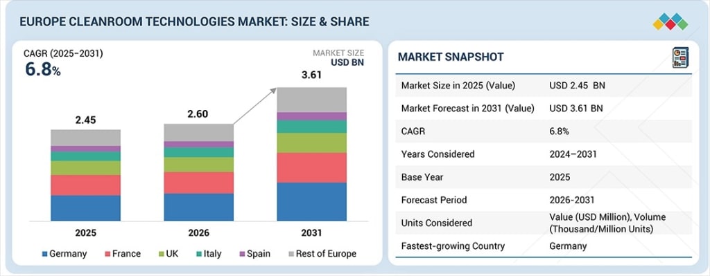 As Europe’s high-precision manufacturing sectors intensify their focus on quality, compliance, and sustainability, the Europe Cleanroom Technologies market is emerging as a strategic enabler of growth. Valued at USD 2.45 billion in 2025 and USD 2.60 billion in 2026, the market is projected to expand at a robust CAGR of 6.8% from 2026 to 2031, reaching USD 3.61 billion by the end of the forecast period. This growth reflects not only rising regulatory scrutiny, but also accelerating investments across pharmaceutical, biotechnology, semiconductor, and aerospace industries.