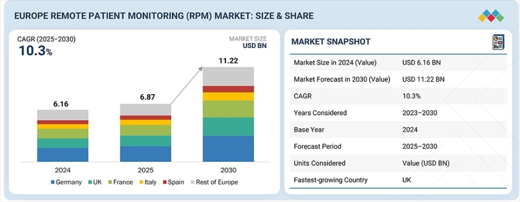 The Europe Remote Patient Monitoring (RPM) market is entering a decisive phase of expansion as healthcare systems pivot toward preventive, community-based, and digitally enabled care models. Valued at USD 6.87 billion in 2025, the market is projected to reach USD 11.22 billion by 2030, growing at a CAGR of 10.3% from 2025 to 2030. This growth reflects rising investment in home-based care, strengthening cross-border digital health infrastructure, and increasing demand from providers for real-time patient data to enable early intervention, reduce readmissions, and ensure continuity of care across decentralized settings.