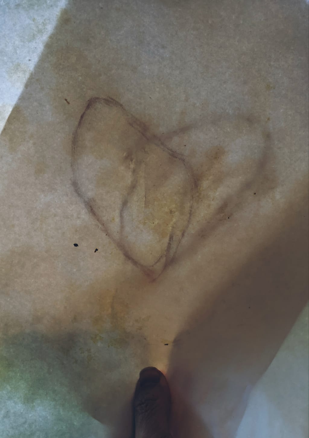 Rhena walked to the right of where Lola sat and grabbed some paper from the planning table. She dipped her finger in the pile of ash in the bucket atop the table. She drew an oval that tapered smaller at the bottom.