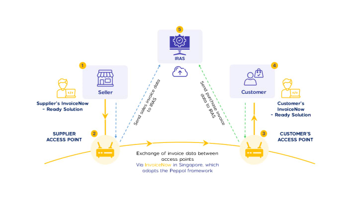 IRAS is connected to the InvoiceNow network via an additional “fifth corner” in the traditional Peppol model, allowing for secure data submission through APIs.
