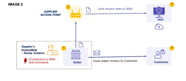 For a supply transaction made outside the InvoiceNow network (e.g., where the customer is not on the InvoiceNow network, or where the transactions are made using point-of-sale (“POS”) systems or to customers who are individuals), the transmission of the invoice data to IRAS occurs in the following manner: