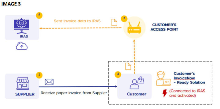 (a) The GST-registered customer receives a paper/ PDF invoice for the purchase transaction and records the transaction in its InvoiceNow Ready Solution.