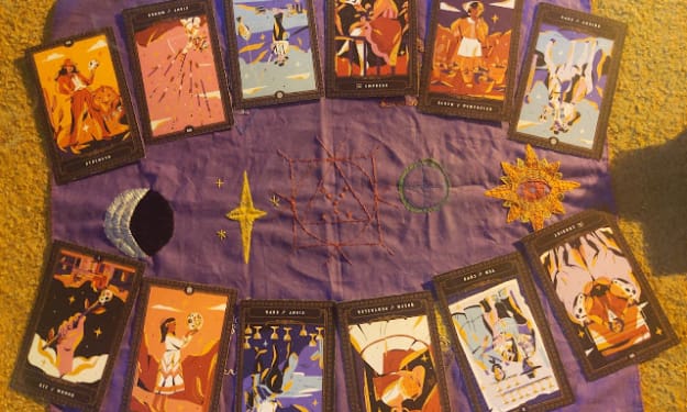 Prior to the reading proper, the usual few minutes are taken by me to sit, spread out my altar cloth, light some incense, and clear my cards. Every witch has their own method of doing this; clearing cards, and any energetic workings, really, are highly subjective. I find it's usually best practice to play around with different methods and see what feels right for you. My method of clearing my cards is as such; I begin by shuffling the cards for a bit, then I knock on the deck once, blow through the cards, hold them in the incense smoke - Mugwort, today - for a brief moment, and cut the deck. As I reshuffle the cards back together, I begin to think about the intent of the reading, so in this case, the coming week and the twelve signs of the zodiac, in the order of this reading.