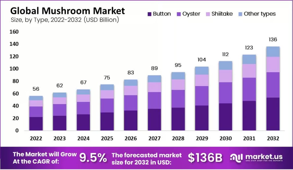 Mushroom Market Report: USD 136 Billion by 2032 at 9.5% CAGR