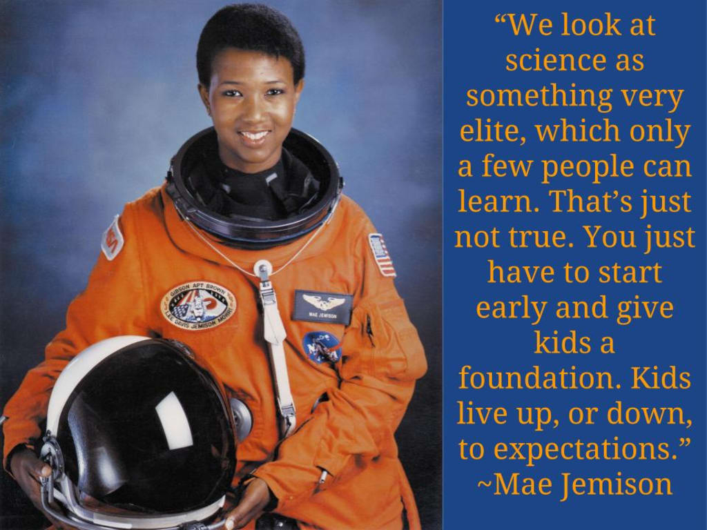 Soon, her family moved to Chicago, so her mother could teach Math and English at Ludwig van Beethoven Elementary School. That, in itself, was an accomplishment back in those days; because for a woman to teach Math, conflicted with gender norms at the time. Perhaps Mae gained her determination from her mother. And perhaps she gained her strong work ethic (which is just as important) from her father, who was a roofer and carpenter. What I do know is that it’s on record that both her parents encouraged this curious little girl’s interest in the sciences. It started out with an interest in Human Physiology. Have you ever had a little girl tell you she was interested in a career in science or medicine, and instead of encouraging her to become a doctor or scientist, the adults assume she should be a nurse? Well, that’s what Mae’s Kindergarten teacher did to her… discouraged her to shoot for something ‘more attainable’. But, in the school library she could pursue whatever interests she desired as she was growing up; so books on astronomy especially captured her imagination. All that reading probably helped her to become a consistent honor student. I have fond memories of the library when I was young, too. Mae’s appreciation of the importance of reading for children is just one more reason why I admire her.