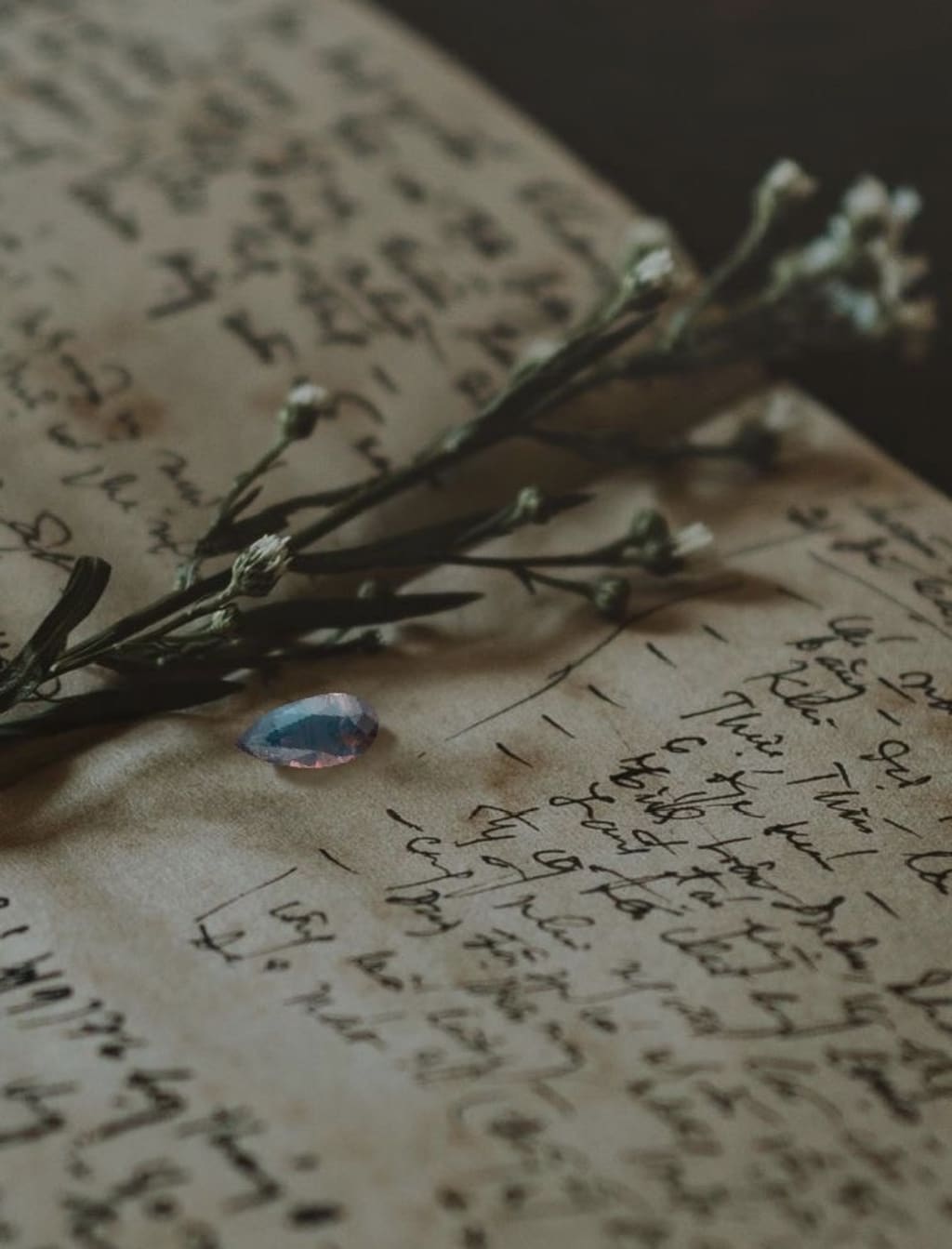 Something stirred amongst the reeds growing in the water nearby. Whispers began to erupt. Eeriness ran through the undergrowth. The soft breeze growing cold as grey clouds rolled by, covering the sun like blankets. Aspen shot up, her piercing sky blue eyes searching. Everything was dead silent. Shivering she got up, noticing the change in weather. Goosebumps forming along her skin. “Strange” she muttered. The whispers started again, this time muffled. The sounds caused chills to run through her. Stepping towards a dense group of trees, she noticed something placed upon a rock surrounded by reeds. Curiosity pulled at her. Pushing aside the uncanny sensation of being watched, she moved towards it. “A book?” She thought “Where did this come from?” Its leathered surface was black as midnight, smooth with a complex pattern swirling along its surface. Picking it up, she flicked through pages of intricate drawings. Measurements and detailed notes on precious stones went from page to page. One of the sketches tugged at her attention, it’s colours holding her in awe. Underneath it scrawled the words “colour changing”. She reached out, stroking the page.