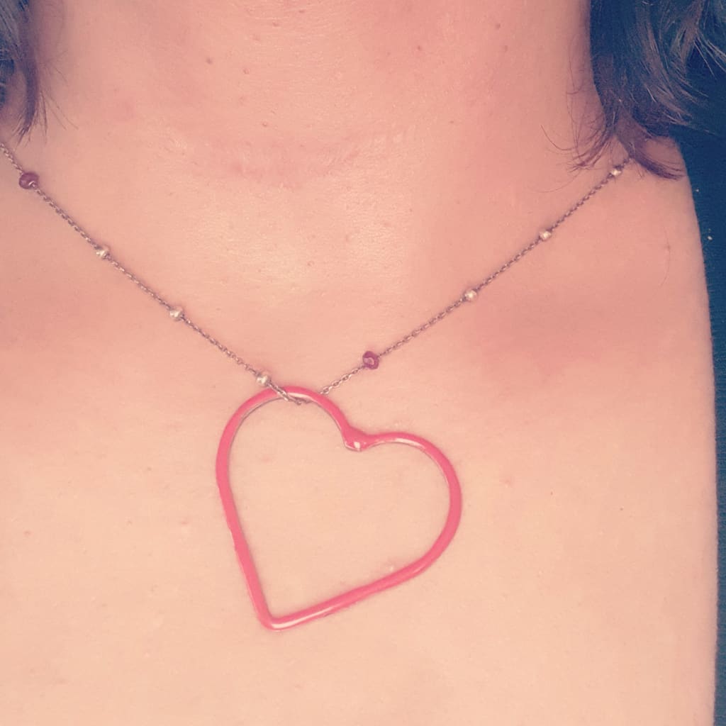 He puts his hand up to her neck and touches something hard and metallic hanging from a chain. He breaks away from the kiss to see a heart-shaped necklace at her throat. Just as he’s about to ask her where she got it from, there’s a pain at the base of his neck from a blow so hard that he sees pinpoints of bright light skidding across his vision. He releases the woman from his embrace and slumps forward into her lap. A trickle of blood snakes its way down his neck.