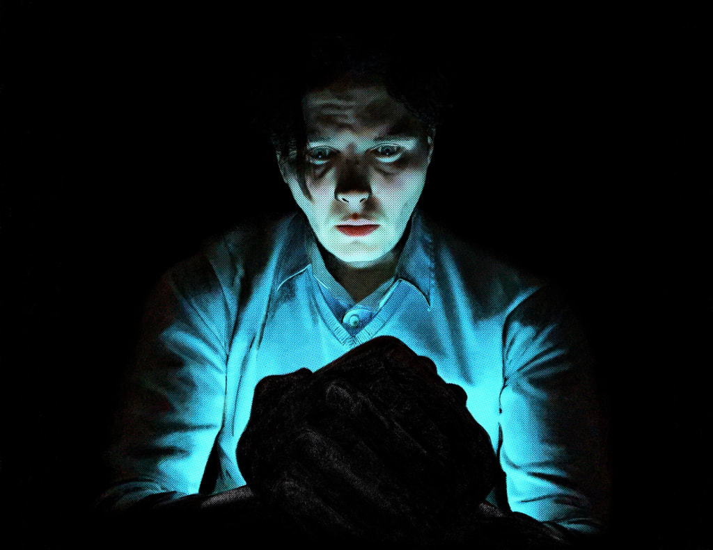 He looked outside. Where there had been nothing all night long, now stood the silhouettes of seven people looking up at his window. The darkened faces revealed no discernible features, but what he saw shook him to the core. In place of eyes, a tiny flicker of blue light emanated from within the sockets. All fourteen tiny blue stars converged on his gaze. He quickly stepped away from the window and pressed his back against the wall. He turned to Melos for comfort. The cat looked back, unfazed.