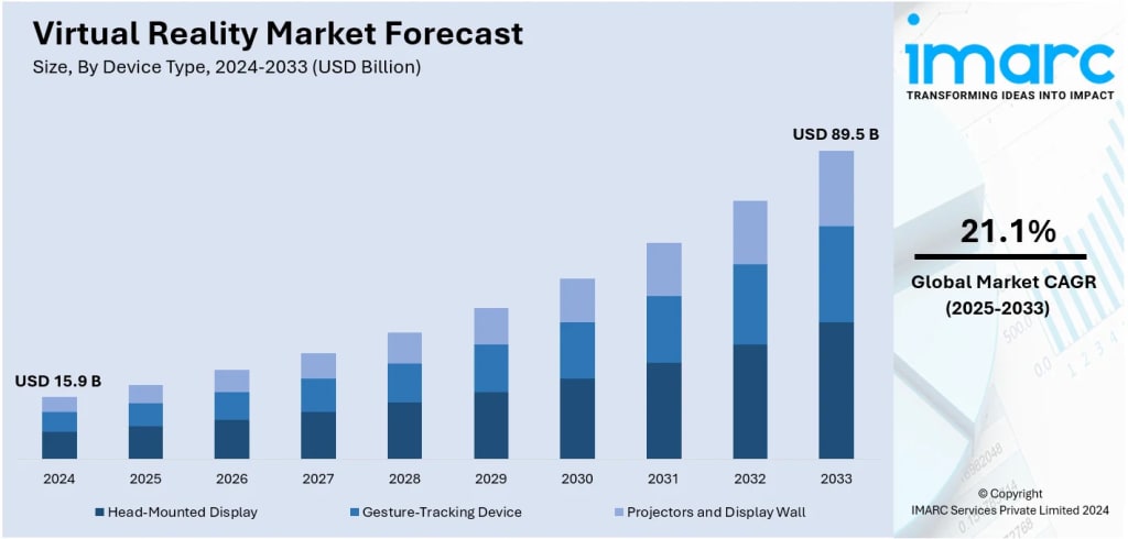 Growing demand for immersive gaming and entertainment experiences, expanding healthcare applications in surgical training and pain management, and increasing enterprise adoption for training and simulation are fueling the virtual reality market's expansion. According to IMARC Group's latest data, the global virtual reality market size was valued at USD 15.9 Billion in 2024. Looking forward, IMARC Group estimates the market to reach USD 89.5 Billion by 2033, exhibiting a CAGR of 21.1% from 2025-2033.