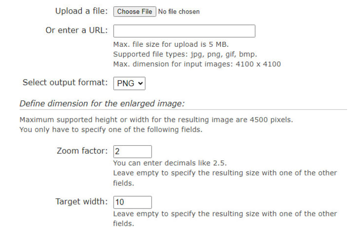 Imagenlarger is a completely free online platform to upscale photos losslessly. Simply input your photo, choose how big you would like to upscale it, and you are ready to download the result for a few seconds. Compared to Bigjpg, it can even upscale GIF and BMP pictures. There are three options for you to customize the output resolution, either by a ramdom zoom factor, specific height or width. Note that the maximum resolution for the result picture is 4500 and there is an upload limit of 5M (same as Bigjpg) for file size and a 4100*4100 limit for image resolution.