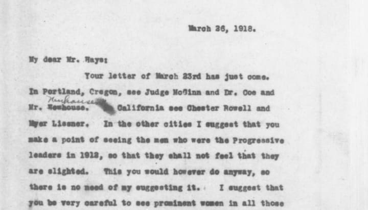 Your letter of March 23rd has just come. In Portland, Oregon, see Judge McGinn and Dr. Coe and Mr. Newhouse. In California see Chester Rowell and Myer Lissner. In the other cities I suggest that you make a point of seeing the men who were the Progressive leaders in 1912, so that they shall not feel that they are slighted. This you would however do anyway, so there is no need of my suggesting it. I suggest that you be very careful to see prominent women in all those states. Personally I have found the women often like to be summoned together with the men, and some resent being called to a meeting by themselves. This is not an invariable rule, but I have found such a condition of mind so frequently that I venture to put you on your guard about it. It is perfectly true that the women are very apt to concentrate their attention purely on the suffrage issue and prohibition, and there is very real need that we should begin to take them in to [sic] our councils generally.
