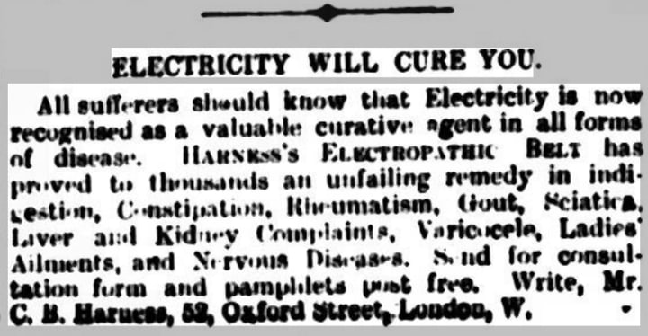 Electricity became this grandiose symbol of modernity. The pinnacle of human achievement: we were on a cultural high. Thus, many advertisements took advantage of this phenomenon and claimed it cured practically any ailment: