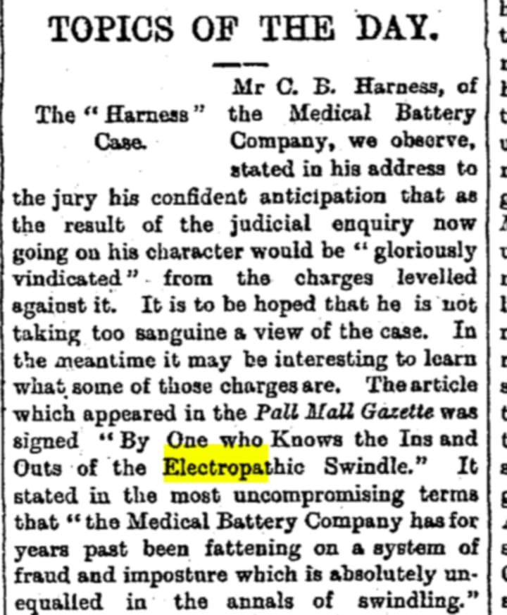 The following year, "The Pall Mall Gazette" — a newspaper that had previously supported Harness and his products — published an exposé on this product titled "The Electropathic Belt Swindle", which stated the following: