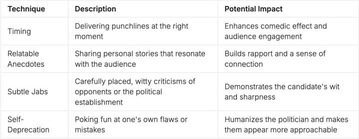 - Subtle Jabs: A well-placed joke about an opponent can make people laugh and show off the candidate's quick thinking.