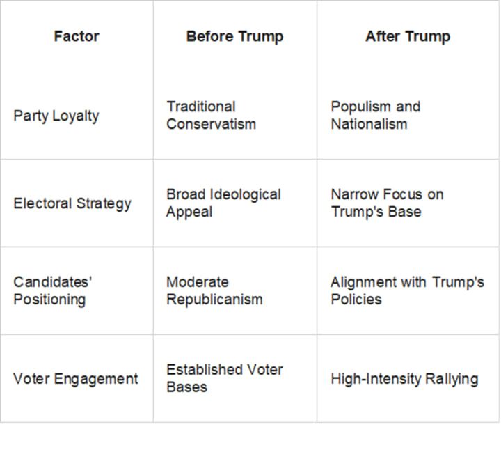 Older values of being conservative are not as important anymore. Candidates now have to agree with Trump to get support. This is because Trump's ideas are what many people want to hear.