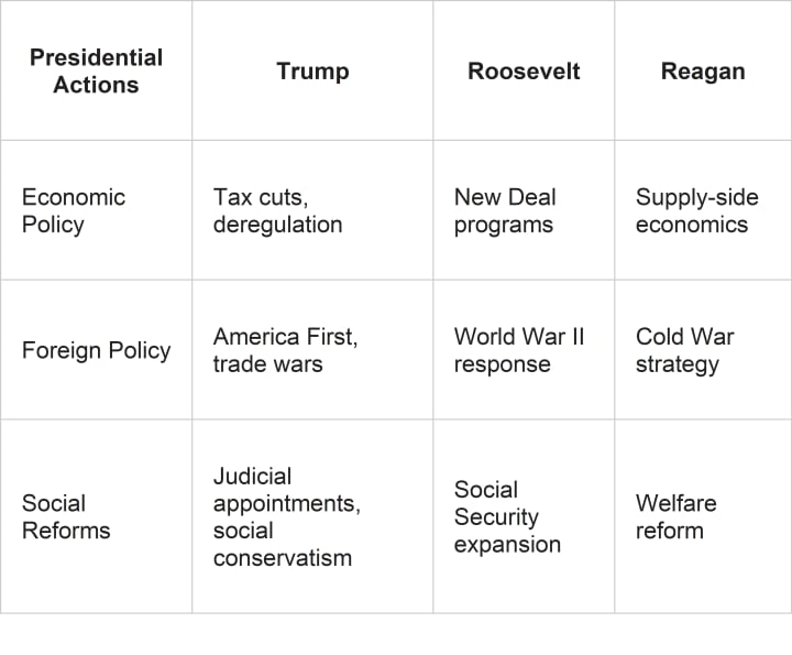 Trump's presidency was different. It changed how we see the job of the president. People compare him to Franklin D. Roosevelt and Ronald Reagan. Both were big leaders in U.S. history.