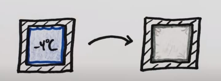 Water freezes solid at minus 4 degrees Celsius and atmospheric pressure, but when the pressure is raised, the solid water thaws out to become liquid again. What happens if you prevent the water from expanding when it freezes? The water wants to freeze when the temperature drops below 0 degrees Celsius, but only some of it can since any frozen chunks expand, forcing the container till at last the pressure is high enough to prevent any additional liquid water from freezing at that temperature! Following the liquid-solid transition line in the direction of the phase diagram, Once the pressure has built back up enough to prevent any additional liquid water from freezing, cooling the container any further will allow a small number of additional water droplets to freeze and grow. So forth. The percentage of ice and strain inside the container rises as the container cools.