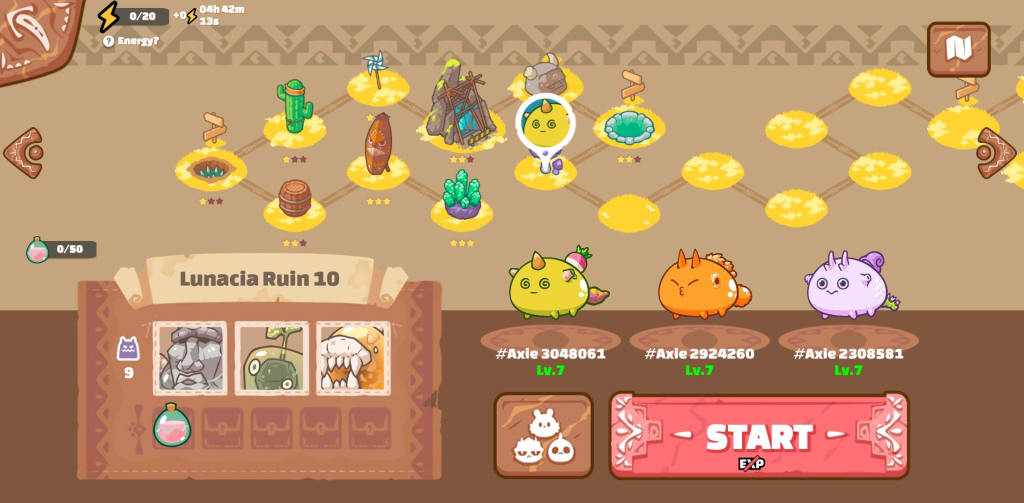 Players aim to accumulate enough experience points to be able to attain the 50 SLPs (the Adventure Mode SLP earnings cap) within the shortest time. While higher levels provide more SLPs, there is a limit to how much you can earn.