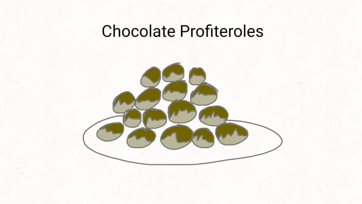 Profiteroles with chocolate covered on them. Chocolate...not for Moco not for animals as it's bad for them.