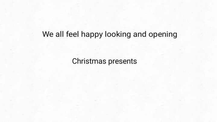 In the image says We all feel happy looking and opening Christmas presents. They do look happy opening their presents, it is a great feeling when taking off the wrapping paper to see the surprise.