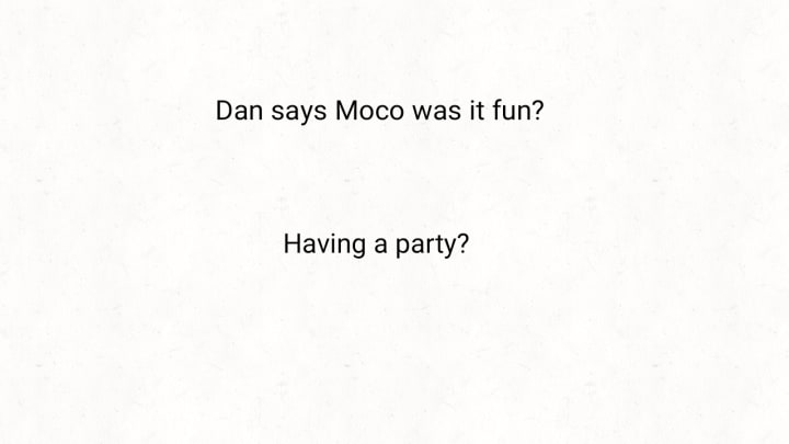 Eventually, Dan starts to speak. Moco stays quiet as he usually does when Dan is going to say something. He enjoys listening to Dan when talking. It soothes Moco's ears and makes him happy!