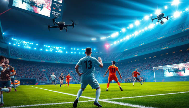 A dynamic soccer scene featuring a futuristic stadium filled with cheering fans, illuminated by vibrant lights, showcasing players in action wearing sleek, modern jerseys. The field is lush and green, with advanced technology like drones capturing the game from above. Elements of digital interfaces and augmented reality enhancements surround the scene, emphasizing the next level of soccer gaming experience.