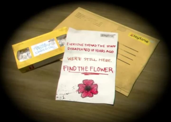 Set in an abandoned toy factory owned by the fictional toy-making company, "Playtime Co.," you play as an unknown former employee of the factory. After receiving a mysterious letter in the mail from Playtime Co. in the year 2005, the player returns to the factory 10 years after all of the staff within disappeared without a trace. Told to "find the flower," the twisted journey begins.
