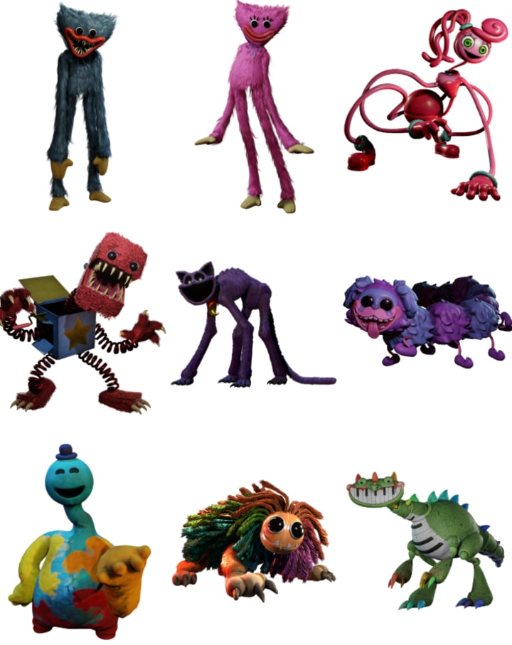 Huggy Wuggy (top left), Kissy Missy (top middle), Mommy Long Legs (top right), Boxy Boo (middle left), CatNap (middle), PJ Pug-a-Pillar (middle right), Doey (bottom left), Yarnaby (bottom middle), Pianosaurus (bottom right)