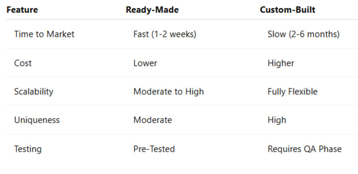Go with Ready-Made if you want quick market entry, limited budget, and proven features.