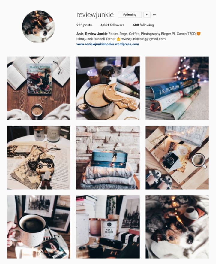 We’re moving across the world with this account. The photographer, Ania, is Polish, but if you don’t know the language, don’t worry, because she writes her captions with Polish and English. She also features books in both languages. Ania shows a wide range of age groups that include books from young adult to adult. There isn’t a lot of vibrancy in her photos but a kind of cozy feeling with each one. She packs her shots with cool accessories and and other items but never makes them seem to overwhelming.