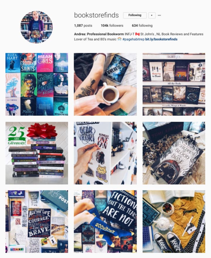 She shows off her tattoos, awesome socks, and abundance of books all the time. There are also always questions and fun comments in the captions. This is definitely a very outgoing and flashy aesthetic for books, but one that totally brightens any mood. She will show off some great book quote posters or a section from a bookstore she loves. Andrea also does giveaways every now and again, so if you are always looking for places to save on books, check it out.
