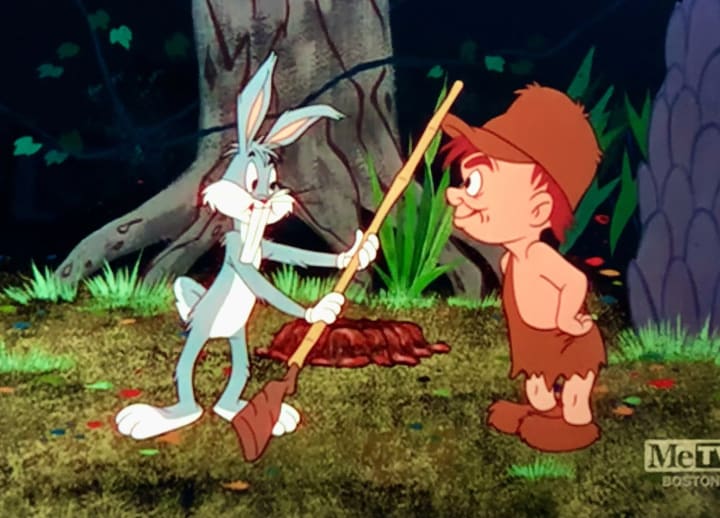 Even Bugs Bunny was part of the experience of working to Seely's music. The fourth "Seely Six" short, Pre-Hysterical Hare, was released on November 1, 1958, and it features Bugs pursued by Elmer Fudd. "Someday, they'll outlaw this annual madness known as rabbit season," Bugs frets before he falls into what's revealed as a prehistoric cave. He finds a video reel and plays it, and it's revealed to be footage of prehistoric times, with an ancient saber-toothed rabbit being hunted by a caveman Fudd, who is easy outsmarted. "Those smart hunters were never a match for us dumb rabbits," Bugs boasts. A fun fact: this was one of two Elmer Fudd cartoons released during Arthur Q. Bryan's lifetime, that Bryan did not voice the character. In this short, Dave Barry voiced Fudd. The only other such short was The Scarlet Pimpernel, which saw Fudd's one line provided by Mel Blanc.