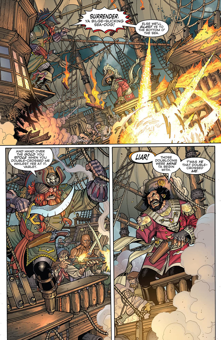 The interiors here are abso-bloody-lutely amazing to see. The linework is exquisite and how we see the varying weights and techniques being utilised to create this level & quality in all the detail work that we see is mindbogglingly brilliant. The creativity and imagination in creating the backgrounds and how they enhance and expand the moments is phenomenally well rendered. How they work within the composition of the panels to bring out the depth perception, sense of scale and the overall sense of size and scope to the book is marvellous. The utilisation of the page layouts and how we see the angles and perspective in the panels show a masterful eye for storytelling. The colour work is equally as brilliant to see. The various hues and tones within the colours being utilised to create the shading, highlights and shadow work shows this amazing eye for colour and knowing how it works and what combinations have the most impact.