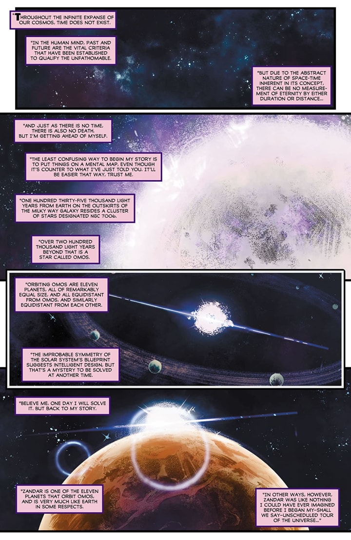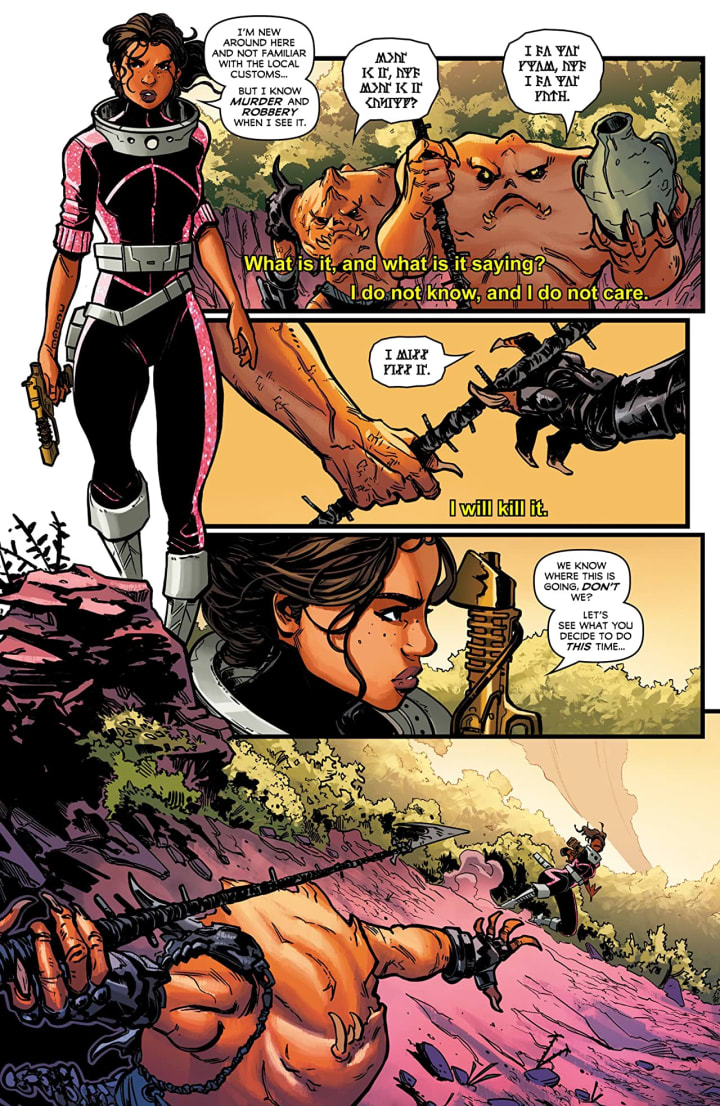 The interiors here are completely and utterly gorgeous to see. The linework is clean, crisp and strong and how we see the varying weights and techniques being utilised to create the attention to detail throughout is marvellous. The creativity and imagination that’s on display is phenomenal to see as well and whether it’s the alien races or the way we see the gun fire everything has this mood, tone and feel that’s just bloody brilliant. That we see backgrounds being utilised as we do to enhance and expand the moments is incredibly well rendered. How they work within the composition of the panels to bring out the depth perception, sense of scale and the overall sense of size and scope to the story is wonderfully done. The utilisation of the page layouts and how we see the angles and perspective in the panels show a remarkably talented eye for storytelling. How we see the various hues and tones within the colours being utilised to create the shading, highlights and shadow work shows a brilliant eye for how colour works and how to maximise their effects.
