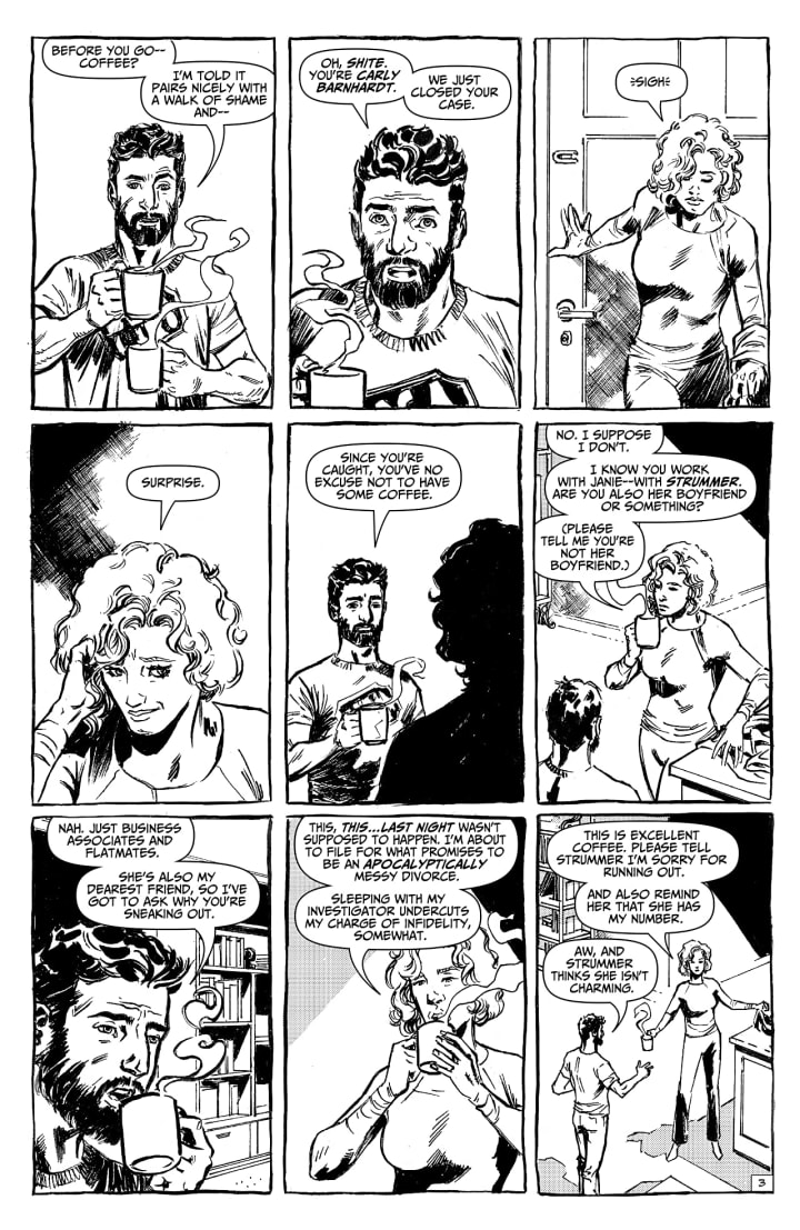 I am very much enjoying the way that this is being told. The story & plot development that we see through how the sequence of events unfold as well as how the reader learns information is presented exceptionally well. The character development that we see through the dialogue, the character interaction as well as how they act and react to the situations and circumstances which they encounter continues to flesh them out in some really great ways. The pacing is superb and as it takes us through the pages revealing more and more of the story we’re drawn deeper and deeper into this world and the mystery surrounding who shot Strummer and is after her.