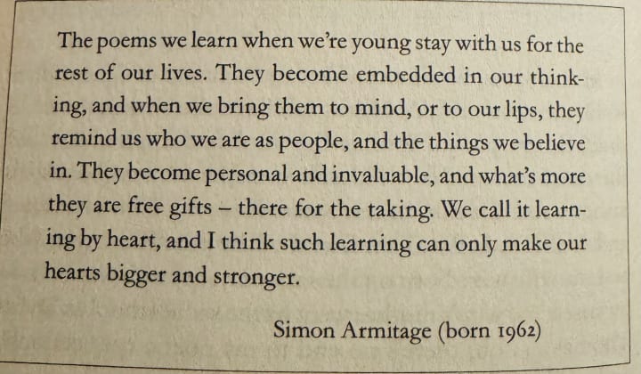 Dancing by the Light of the Moon is named after Gyles Brandreth's favourite childhood poem The Owl and the Pussycat by Edward Lear. He takes us through the process and reasoning behind memorising poetry and wrongly seems to assume that this was only an activity enjoyed by the older (Boomer) generation. Needless to say, the Millennials have memorised our fair share. But, he takes us through not just the reasons surrounding memorising poetry (and how it can be good for your health), but he helps with the process if you're really struggling to do it. Throughout this, he litters the reader with some of his most beloved poems from youth and beyond. Poetry, to Brandreth, is much more than just a formulation of words on a page, but they are the epitome of art - the very words of the soul. In one section, he lists in order of time what different poets think about poetry and its meanings. This is a quotation by Simon Armitage on the subject, quoted and boxed within the book: