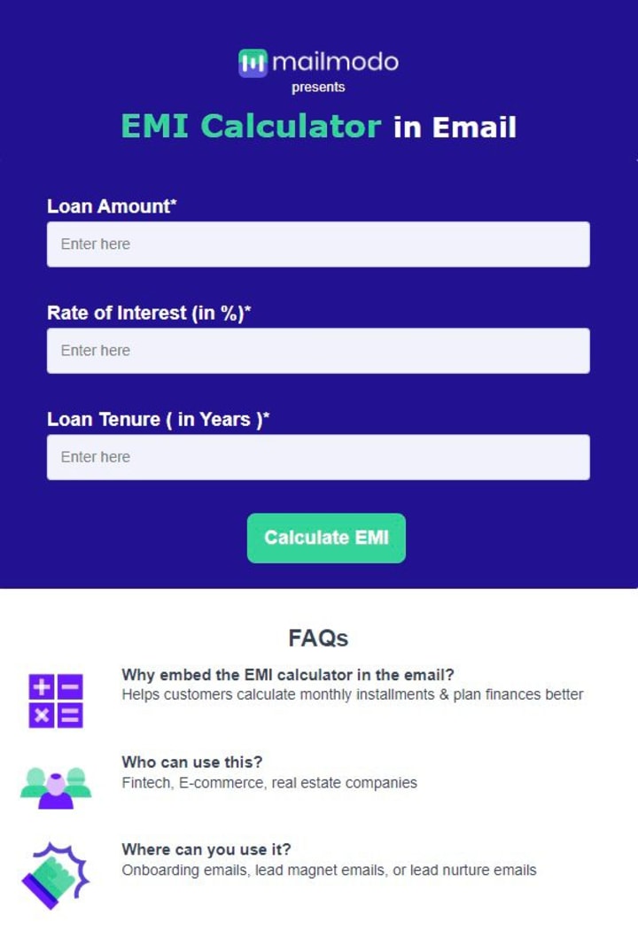 Picture this – you work in a marketing team at a Fintech firm and need to promote the latest mutual fund. Now, imagine having the power to send your clients a SIP calculator directly in their email.This way, you enable your audience to calculate their EMI estimates without leaving their inbox and take an informed decision immediately reducing the time taken to convert.