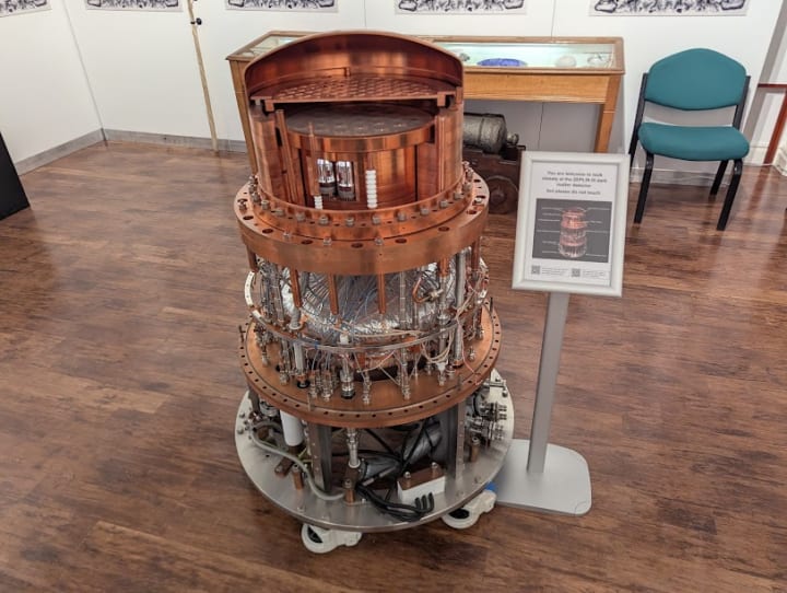 The Zeplin III Dark Matter detector caught my eye at first as it is sat in the middle of the exhibition. It was previously used in Boulby Underground Laboratory as a dark matter detector and was donated to Whitby Museum in 2018 by Imperial College London.