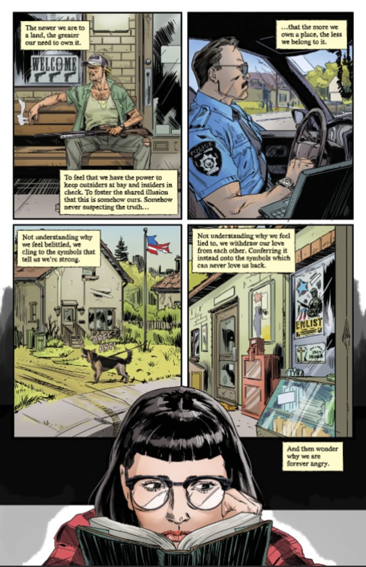 The story within a story within a story is brilliantly handled by Mark and what we see and how it works to tell the story is simply bloody amazing. I love Mark’s writing and how he’s able to craft a story and make everything feel as important to learning what is going on. Whether some are red herrings or not it all feels as if it means something. With some of the most insanely great writing and very dynamic and distinctive interior artwork is going to change the way you think about storytelling.