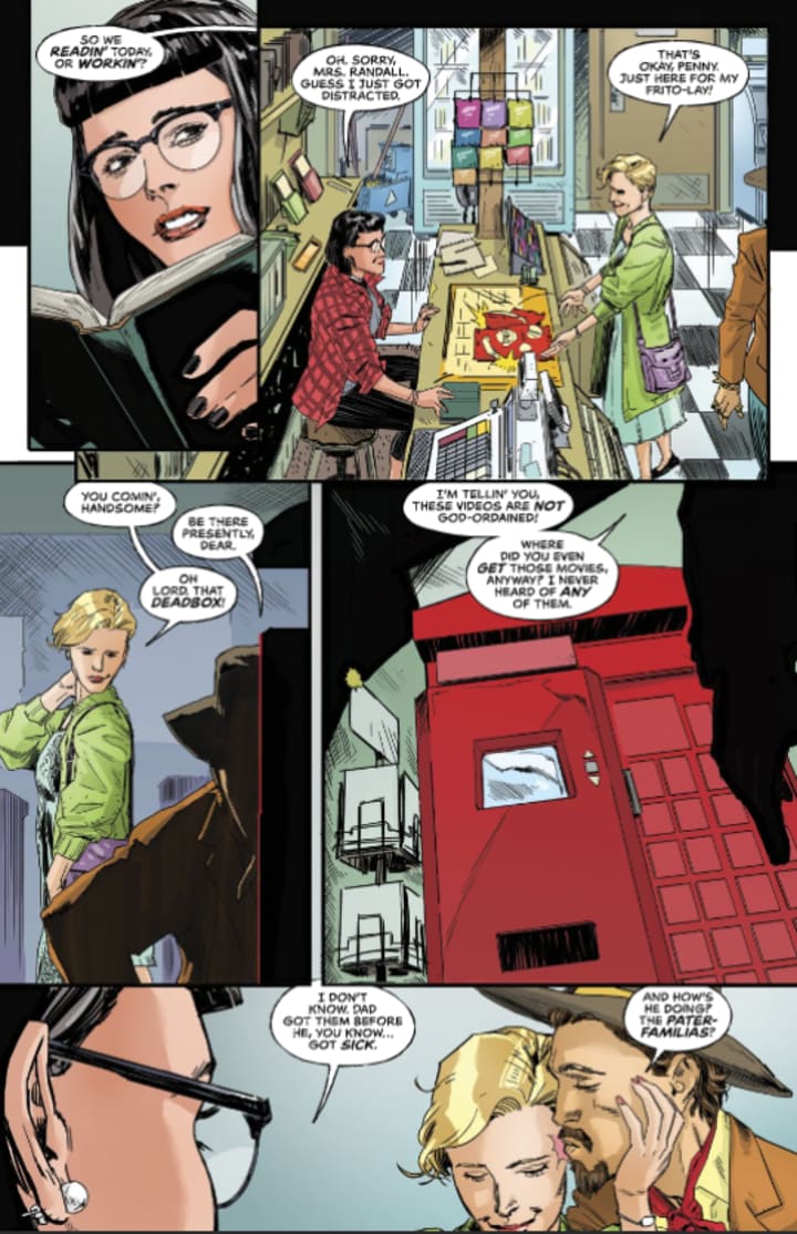 This was one hell of an introductory issue and it raises questions, engages the reader and raises the hackles on the back of your neck. This really starts off with such an interesting narration that immediately grabs the readers’ attention and makes you realise just how little our so-called modern society has really advanced. It is also where we meet Penny who is the central character here and she’s the catalyst for how this story is being told. Now we’ve all seen those Redbox movie boxes and they were popular before the internet took hold and the need to rent videos ended. This box however is unique and Penny’s father installed the box before he gets sick and she needs to come home from college to care for him. We have no idea what he’s sick with and quite honestly it’s the kind of mystery we want to see.