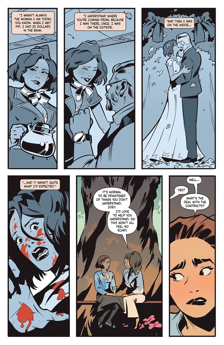 This shit is bananas B.A.N.A.N.A.S. and I am eating up every single moment of it. Now if you were paying attention to the last issue, was last night, Joey found out a lot about what’s going on within this community. So the way this issue goes, many of Joey’s questions are answered by an unlikely source who, if you remember, knew she was out and about wandering the house. I love how Sarah tells this issue's story because it really keeps the tensions high and interest piqued up past ten. So Joey has a huge dilemma on her hands but she loves Astor and she’s unsure to what extent things are happening and how deep into all this her boyfriend is.