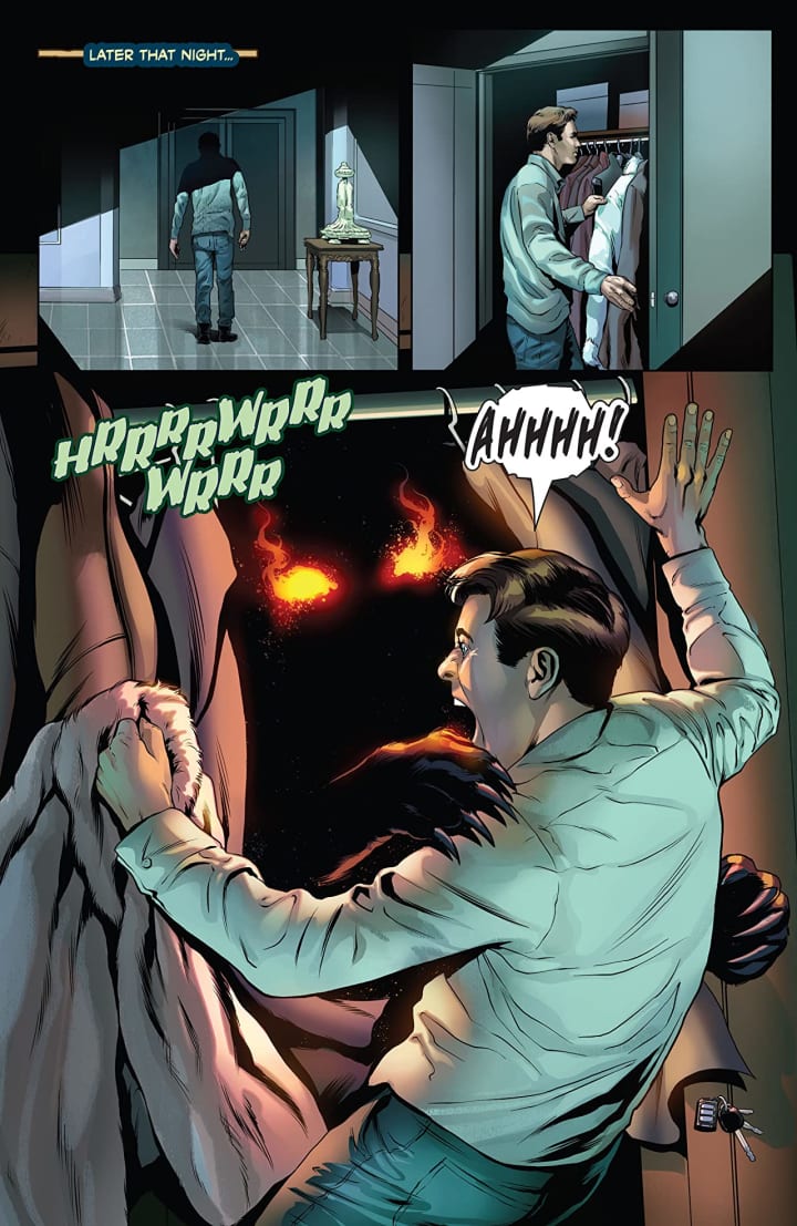 The interiors here are absolutely phenomenal to see! I know different folks did different sections but that apartment of his is to die for. From the way you see the city outside the window to the painting above the fireplace and the light sources hitting the wainscotting it all has this perfect flow to it. The linework is fantastic and how we see the varying weights and techniques being utilised to create the detail work is extraordinary. That we see backgrounds utilised so often throughout the book is amazing as it really enhances the moments as well as how it works within the composition of the panels to bring out the depth perception, sense of scale and the overall sense of size and scope to the book. The utilisation of the page layouts and how we see the angles and perspective in the panels show some really strong talented eyes for storytelling. I’m loving the colour work we see as well. How the various hues and tones within the colours are being utilised to create the shading, highlights and shadow work to maximise the affect that colour is capable of is rendered beautifully.