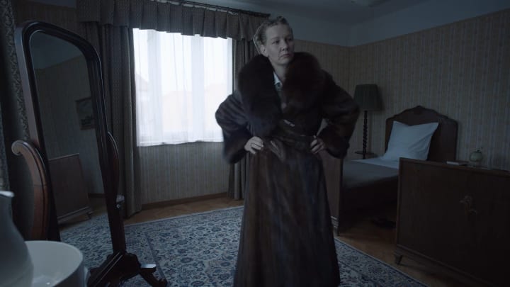 Meanwhile, his wife is entertaining friends and family in their well appointed home. The film unfolds a number of callous and cruel scenes as packages are delivered to the home and it slowly dawns on us that the various pieces of clothing and personal items are those of Jewish people being murdered next door. For example, Hedwig receives a package containing a mink coat. She tries it on and poses in front of a mirror. She finds a lipstick in the pocket and starts applying it. She's as carefree as if she'd just purchased these items and they belong to her. If she cares at all where these items came from or how she's taking things that belonged to people her husband is murdering, you can't see it on her face or in her eyes. There is a sociopathic level of not caring in Hedwig. Her sense of cruel entitlement is soul shaking for anyone with a conscience.