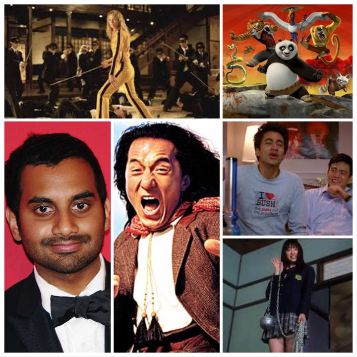 Shanghai Noon is a 2000 American-Hong Kong martial arts western comedy film written by Alfred Gough and Miles Millar starring Jackie Chan and Lucy Liu. The film, set in Nevada and other parts of the American West in the 19th century, is a juxtaposition of a western with a kung fu action film with extended martial arts sequences. It also has elements of comedy and the "Buddy Cop" film genre, as it involves two men of different personalities and ethnicities (a Chinese imperial guard and a white Western outlaw) who team up to stop a crime. It had a sequel, Shanghai Knights in 2003 (from Wikipedia). Charlie’s Angels starred Lucy Liu as an Angel which is huge for Asians as the original roles were never minority roles. It is a 2000 action film written by Ryan Rowe, Ed Solomon, John August and based on Charlie's Angels by Ivan Goff and Ben Roberts. Romeo Must Dieis a 2000 American action film directed by Andrzej Bartkowiak in his directorial debut, and also fight choreography by Corey Yuen, and starring Tyzell Anderson and Aaliyah. Screenplay by Eric Bernt and John Jarrell from the story by Mitchell Kapner. The film was released in the United States on March 22, 2000. In the film, a Chinese former police officer played by Jet Li travels to the United States in order to avenge his brother's death. He also falls in love with a rival mobster's beautiful daughter and they are struggling together against both the Chinese and the American mobs (from Wikipedia). This film was set in Oakland, CA where I was raised and brings about inter-racial relationship issues. Team America: World Police is a 2004 American-German satirical action comedy film starring puppets produced by Scott Rudin, Matt Stone, and Trey Parker, written by Parker, Stone and Pam Brady and directed by Parker, all of whom are also known for the popular animated television series South Park. There are not very many Asians involved in the movie. It is a satire of big-budget action films and their associated clichés and stereotypes, with particular humorous emphasis on the global implications of the politics of the United States. The title is derived from domestic and international political criticisms that the foreign policy of the United States frequently and unilaterally tries to "police the world." Featuring a cast of super-marionettes, Team America depicts a paramilitary police knocked down as "Team America: World Police," who attempt to save the world from a terrorist plot led by Kim Jong-il. Trey Parker does the voice of Kim Jong-Il (from Wikipedia). Avatar: The Last Airbender, (Avatar: The Legend of Aang in some regions) is an American animated television series that aired for three seasons on Nickelodeon. The series began in February 2005 and concluded with a two-hour episode titled "Sozin's Comet" in July 2008. Avatar: The Last Airbender is set in an Asiatic-like world in which some people can manipulate the classical elements with psychokinetic variants of the Chinese martial arts known as "bending." The series is presented in a style that combines anime with American cartoons and relies on the imagery of East-and-South Asian, Inuit, and New World societies. It follows the protagonist, twelve-year-old Aang and his friends, who must bring peace and unity to the world by ending the Fire Lord's war with three nations (from Wikipedia). In 2010, it became a movie. Written byMichael Dante DiMartino, Bryan Konietzko, Nick Malis, Aaron Ehasz, Ian Wilcox, Tim Hedrick, John O'Bryan, Elizabeth Welch Ehasz, Joshua Hamilton, Joann Estoesta, Lisa Wahlander, Andrew Huebner, Gary Scheppke, Katie Mattila, Justin Ridge, Giancarlo Volpe, May Chan, Matthew Hubbard, and James Eagan. Dante Basco, Jennie Kwan, and Mako do voiceovers for the series. Dev Patel stars in the movie and the role of Aang is played by an American. Kill Bill: Volume 1 is a 2003 American martial arts film written and directed by Quentin Tarantino. Though the heroine is not Asian, there are many supporting members who are. Lucy Liu plays O-Ren Ishi, head of the Yakuza, Sonny Chiba as Hattori Hanzo, master swordsmith who, although long retired, agrees to craft a sword for the Bride, Chiaki Kuriyama as Gogo Yubari, O-Ren's sadistic Japanese schoolgirl bodyguard, and Gordon Liu as Johnny Mo, head of O-Ren's personal army, the Crazy 88 (from Wikipedia). 'Harold and Kumar' is the name for a series of American stoner comedy films starring John Cho (Harold) and Kal Penn (Kumar). The first film, Harold & Kumar Go to White Castle, was released on July 30, 2004, by New Line Cinema and spawned a sequel titled Harold & Kumar Escape from Guantanamo Bay, released four years later. A Very Harold & Kumar 3D Christmas, the third installment of the series, opened nationwide in the U.S. on November 4, 2011 (from Wikipedia). Written by Jon Hurwitz and Hayden Schlossberg, Harold and Kumar are relatable for Asian Americans and stoners everywhere. Aziz Ismail Ansari (born February 23, 1983) is an American actor, comedian, and filmmaker born to a Tamil Muslim family from Tamil Nadu, India. He is known for his role as Tom Haverford on the NBC series Parks and Recreation (2009–2015), and as creator and star of the Netflix series Master of None (2015–) for which he won several acting and writing awards, including two Emmys and a Golden Globe for Best Actor – Television Series Musical or Comedy. Kung Fu Pandais a 2008 American computer-animated action comedy martial arts film produced by DreamWorks Animation and distributed by Paramount Pictures...Set in a version of ancient China populated by anthropomorphic talking animals, the plot revolves around a bumbling panda named Po who aspires to be a kung fu master. When an evil kung fu warrior is foretold to escape after twenty years in prison, Po is unwittingly named the chosen one destined to defeat him and bring peace to the land, much to the chagrin of the resident kung fu warriors (from Wikipedia). Screenplay by Jonathan Aibel and Glenn Berger fr