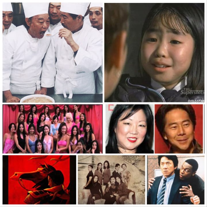In the 90s, American Asian representation in the media seemed nostalgic towards heritage in some ways, but Henry Cho and Margaret Cho were doing standup, as The Joy Luck Club written by Amy Tan, a film set in modern day and also back a generation in China, has a mostly Asian cast illustrates. It showed depictions of Chinese families in America after having emigrated to the US. There were issues touched upon in this movie relating to: an inter-racial relationship, traditions in hereditary culture vs. country of residence, Asian stereotypes of Asian backstage parenting and its effects and definitions of success, independence and feminism from a society that was fine with polygamy and concubines... But it is notable since Tan is one of the first Asian writers for an American film. Eat Drink Man Woman is a Taiwanese movie that was distributed by Samuel Goldwyn Mayer in 94 Written by Ang Lee, James Schamus, Hui-Ling Wang about a Confuscian family, A master Chinese chef and his three daughters set in Taipei. The cooking scenes are spectacular. Ang Lee is quite prolific. Rush Houris a 1998 American buddy cop action comedy film directed by Brett Ratner. It stars Jackie Chan and Chris Tucker as mismatched cops who must rescue the Chinese consul's kidnapped daughter (from Wikipedia). Screenplay by Jim Kouf and Ross LaManna from the story by Ross LaManna. Rush Hour and its sequels have half Asian casts with some depictions of brothels which are true Asian lifestyles. Mulanis a 1998 American animated musical action comedy-drama film produced by Walt Disney Feature Animation for Walt Disney Pictures. It is based on the Chinese legend of Hua Mulan, and was Disney's 36th animated feature. It was directed by Tony Bancroft and Barry Cook, with story by Robert D. San Souci and screenplay by Rita Hsiao, Philip LaZebnik, Chris Sanders, Eugenia Bostwick-Singer, and Raymond Singer (from Wikipedia). It has a half Asian voiceover cast but is empowering for females.
